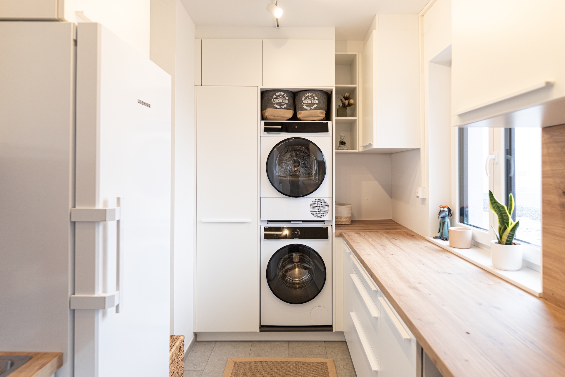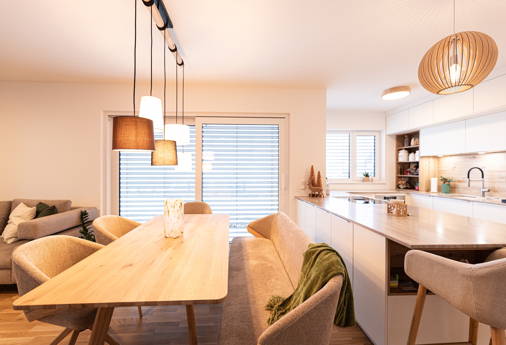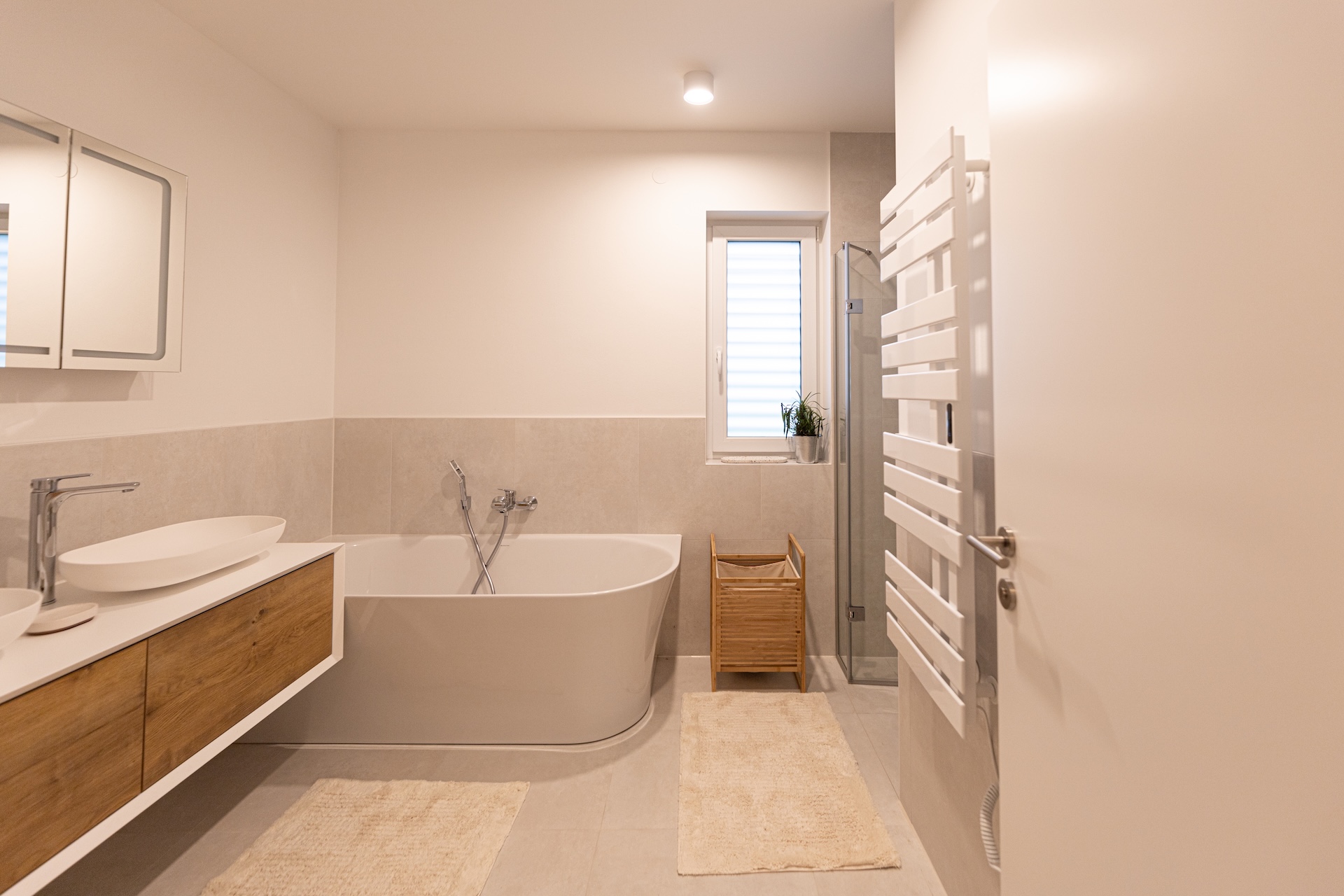 Fenster, Hauseingangstür, Zimmertüren, Terassentüren und elektrische Rollos sind von Josko, das Garagentor von Hörmann oder vergleichbaren Herstellern. Das Staune Haus wird über eine Luftwärmepumpe und Fußbodenheizung beheizt. Im Innenbereich sind ein Echtholzparkett verlegt und Fliesen. Die Badezimmerausstattung ist von Villeroy&Boch, Grohe, Geberit oder vergleichbaren Herstellern.